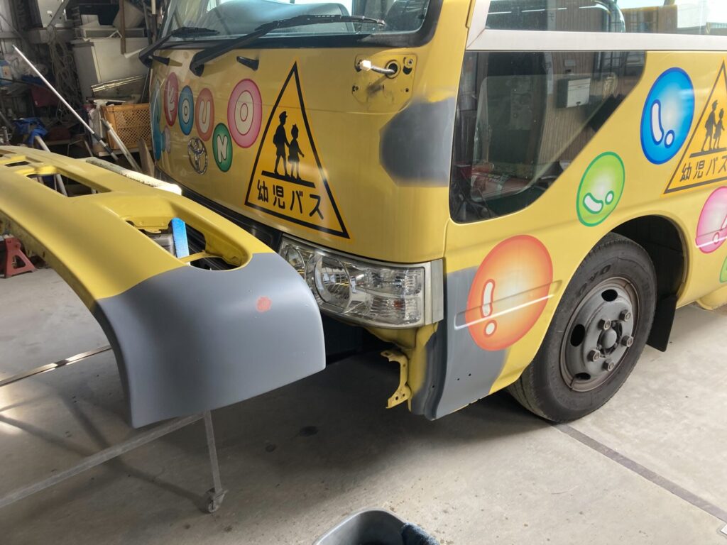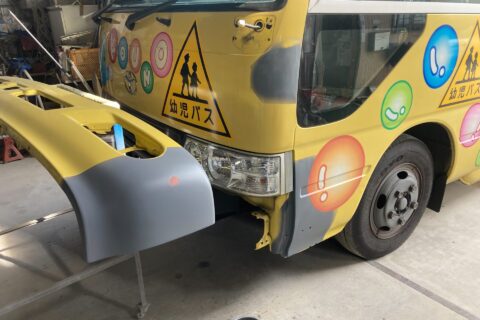 【マイクロバス 板金塗装】佐賀市のお客様|トヨタ コースター|フロントバンパー・左フロント回りの凹みを修理