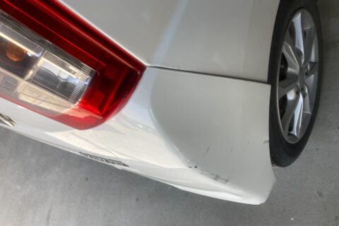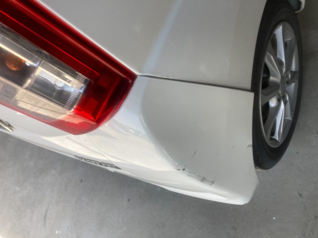 リアバンパーに大きな損傷があり、右クォーターパネルとバックパネルにも凹みやキズができていました。