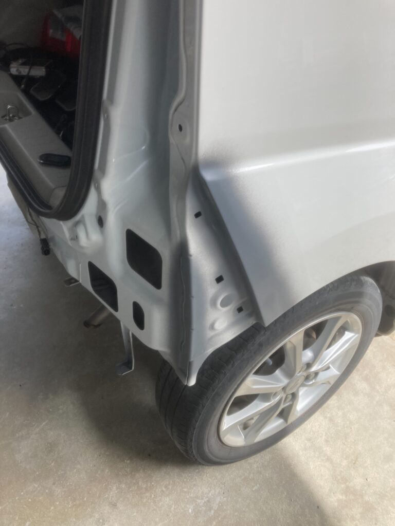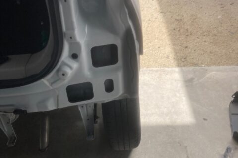 右クォーターパネルとバックパネルの凹みは、専用工具で丁寧に叩き出し、パテで形を整えました。ボディラインの自然さを重視して施工。