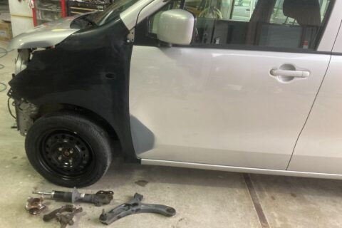 フロントバンパーとフェンダーは損傷が大きいため交換、フロントドアは板金修理で対応。足回りは必要に応じて部品を取替え、安全性と仕上がりの両立を目指しました。