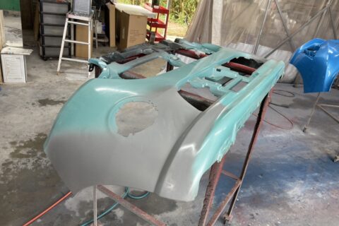 凹み部分を丁寧に叩き出し、パテで形を整えます。ラインや面の歪みを最小限に調整して、交換せずに美しいボディを復元しました。
